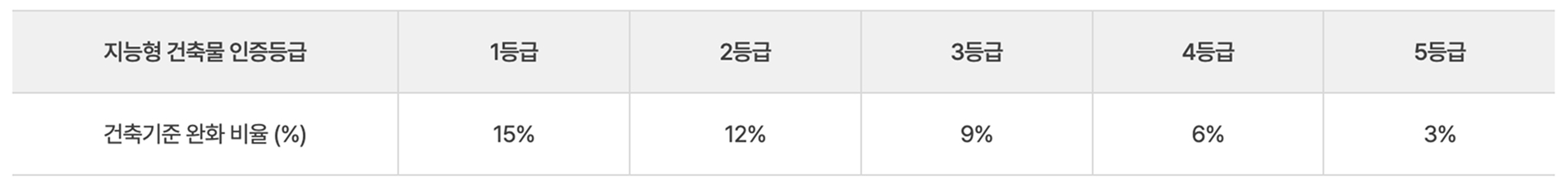 건축법 제65조의2 (지능형건축물 인증)에 의하여 허가권자는 지능형건축물인증 등급을 받은 건축물에 대하여 제42조에 따른 조경설치면적을 100분의 85까지 완화하여 적용할 수 있으며, 제56조 및 제60조에 따른 용적률 및 건축물의 높이를 100분의 115의 범위에서 완화하여 적용할 수 있다.